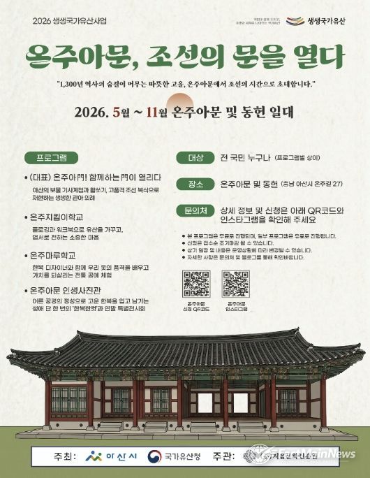 양태진 문화유산과장은 “이번 사업을 통해 온주아문과 동헌이 단순히 관람 공간을 넘어 시민이 직접 참여하고 즐길 수 있는 살아있는 역사 교육의 장으로 자리매김할 것으로 기대한다”며 “앞으로도 지역 국가유산을 활용한 다양한 체험 프로그램을 지속적으로 확대해 나가겠다”고 말했다.