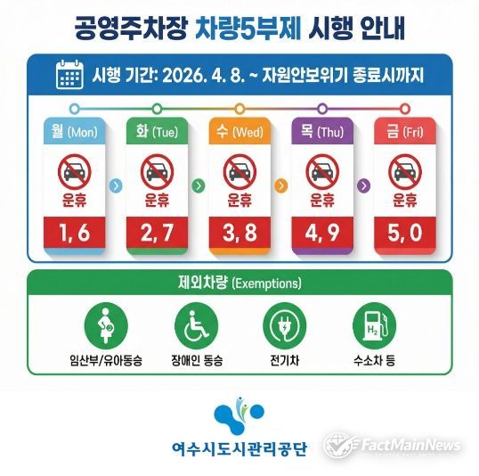 팩트메인뉴스 이훈 기자 | 여수시도시관리공단(이사장 송병구)은 최근 중동 사태로 인한 자원안보 위기 ‘경계’ 단계 발령에 따라, 오는 4월 8일부터 자원안보 위기 경보 해제 시까지 관내 공영주차장을 대상으로 ‘차량 5부제’를 민간 부문까지 확대 시행한다고 밝혔다.