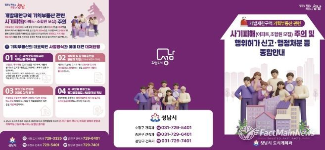 팩트메인뉴스 이훈 기자 | 성남시는 최근 개발이 불가능하거나 제한적인 개발제한구역(그린벨트) 내 토지를 곧 해제될 것처럼 속여 고가에 판매하는 이른바 ‘기획부동산’ 사기가 증가함에 따라 시민 주의를 당부하고, 안내문을 제작·배부한다고 밝혔다.