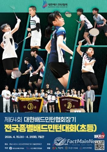 팩트메인뉴스 이훈 기자 | 충남 서산시는 2026 대한배드민턴협회장기 전국종별배드민턴대회(초등부)가 4월 15일부터 21일까지 7일간 서산시민체육관과 서산어울림체육관에서 개최된다고 밝혔다.