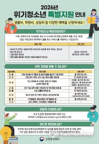 팩트메인뉴스 이훈 기자 | 청도군은 경제적 어려움, 학업 중단, 가정 문제 등으로 위기 상황에 놓인 청소년을 돕기 위해 [2026년 상반기 청도군 위기청소년 특별지원사업 집중 신청기간]을 지난 4월 8일부터 오는 5월 7일까지 운영한다.