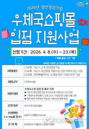 익산시는 '2026년 청년창업기업 우체국쇼핑몰 입점 지원사업'에 참여할 청년창업기업을 오는 23일까지 모집한다.