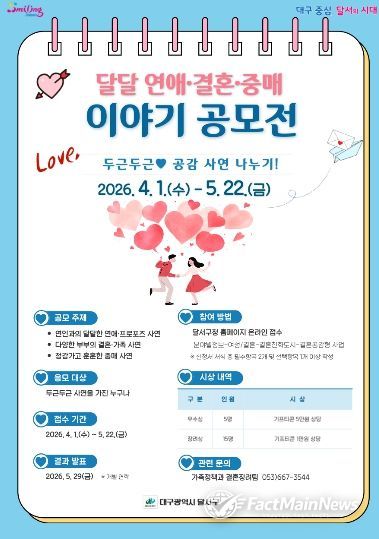 팩트메인뉴스 이훈 기자 | 대구 달서구는 초저출생 문제에 대응하고 결혼 친화적 사회 분위기 조성을 위해 ‘달달 연애·결혼·중매이야기’ 공모 이벤트를 오는 5월 22일까지 진행한다.