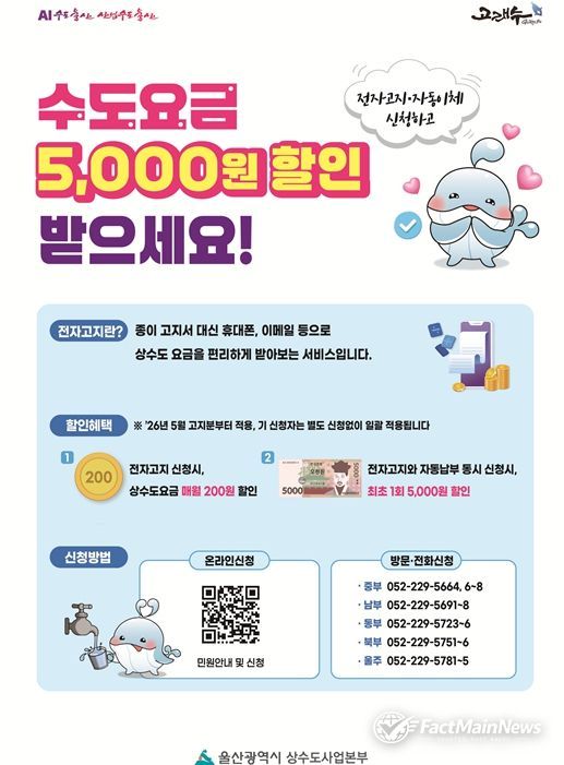 팩트메인뉴스 이훈 기자 | 울산시 상수도사업본부는 시민들의 요금 납부 편의 증진과 종이고지서 사용 감축을 통한 친환경 행정 실현을 위해 오는 5월부터 상수도요금 전자고지 및 자동납부 신청자에게 요금 할인 혜택을 제공한다고 밝혔다.