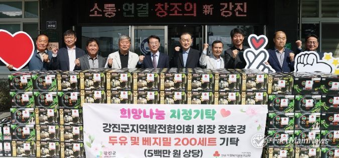 팩트메인뉴스 이훈 기자 | 강진군지역발전협의회 정호경 회장이 지난 2일 강진군청을 방문해 관내 취약계층을 위한 두유 및 베지밀 200세트(500만 원 상당)를 지정기탁하며 지역사회에 훈훈한 감동을 전하고 있다.