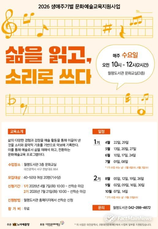 팩트메인뉴스 이훈 기자 | 대전 서구 월평도서관은 중장년층 삶의 궤적을 음악과 문장으로 기록하는 문화예술 프로그램‘삶의 읽고, 소리로 쓰다’와‘선율과 문장’을 운영한다.