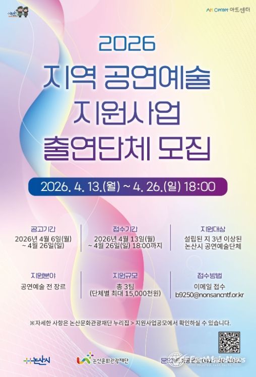 팩트메인뉴스 이훈 기자 | (재)논산문화관광재단은 오는 4월 13일부터 4월 26일까지 ‘지역 공연예술 지원사업’ 출연단체 모집 공모를 진행한다.