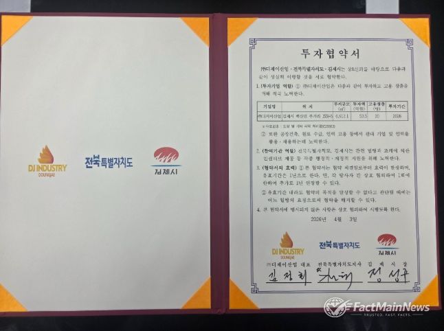 팩트메인뉴스 이훈 기자 | 김제시는 전북특별자치도와 함께 도장 전문기업 ㈜디제이산업(대표 김정회)과 3일, 54억 원 규모의 투자협약(MOU)을 서면으로 체결했다고 밝혔다.