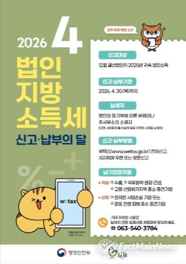 팩트메인뉴스 이훈 기자 | 김제시는 이달 한달 동안 2025년 귀속 법인지방소득세 신고·납부의무 법인이 성실하게 납세의무를 이행할 수 있도록 각 법인에 안내문을 발송하고 시청 홈페이지, SNS 게시 등 다각적인 홍보활동에 나설 예정라고 밝혔다.