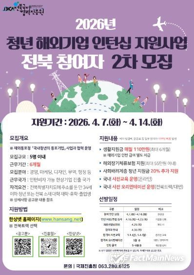 팩트메인뉴스 이훈 기자 | (재)전북국제협력진흥원은 도내 청년의 해외 진출과 글로벌 역량 강화를 위해 '청년 해외기업 인턴십 지원사업' 참여자를 오는 4월 7일부터 4월 14일까지 모집한다고 밝혔다.
