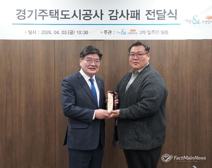 팩트메인뉴스 이훈 기자 | 경기주택도시공사(GH)가 수원 본사에서 다산자연앤이편한세상3차 아파트 입주민들로부터 원활한 조기 분양전환 노력과 제도적 지원에 따른 공로를 인정받아 감사패를 받았다고 3일 밝혔다.