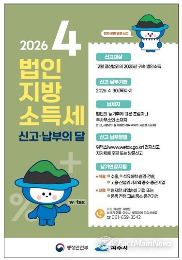 팩트메인뉴스 이훈 기자 | 여수시는 4월 한 달간 ‘2025년 귀속 법인지방소득세에 대한 집중 신고·납부 기간’을 운영한다고 밝혔다.