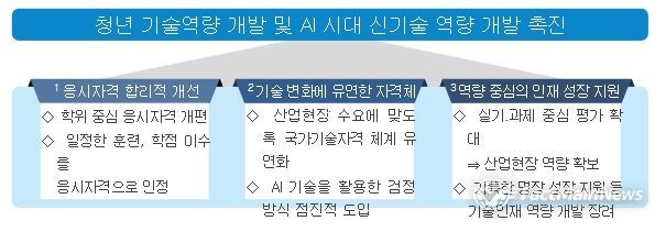 고용노동부는 전문가들의 제언을 토대로 청년층 기회 확대를 위해 올해부터 국가기술자격 응시자격 등 제도 개선을 추진한다. 첫째, 기술사·기능장 등급 시험 응시를 위한 경력 기간을 합리적으로 조정한다. 현재 기술사·기능장 시험에 응시하기 위해서는 최대 9년의 경력이 요구되어 평균 44.8세에 기술사를 취득하는 등 고령화가 심화되고 있다. 이에, 더 많은 청년층이 신속히 기술사·기능장 등급에 진입할 수 있도록 경력 기간을 현행 대비 2~4년씩 단축한다.