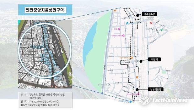 팩트메인뉴스 이훈 기자 | 칠곡군 왜관읍의 중심 상권이 지역상권 활성화를 위한 새로운 전기를 맞이했다. 칠곡군은 지난 3월 31일자로 왜관 원도심 일대가 ‘자율상권구역’으로 최종 지정됐다고 밝혔다.
