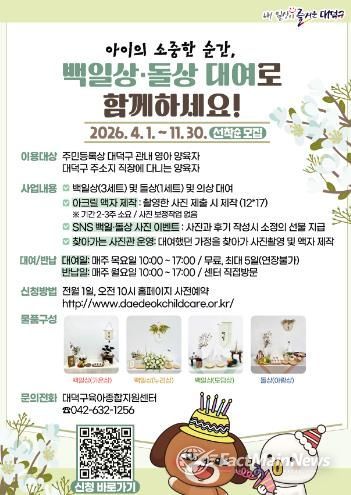대덕구 관계자는 “백일과 돌은 아이의 성장을 기념하는 뜻깊은 순간인 만큼, 이번 사업이 가족에게 소중한 추억을 선물하는 데 도움이 되길 바란다”며 “앞으로도 아이 키우기 좋은 대덕구 조성을 위해 다양한 지원사업을 지속적으로 추진하겠다”고 말했다.