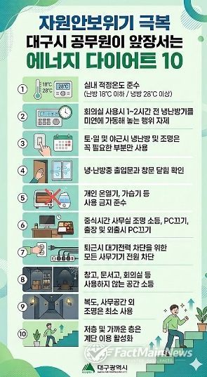 팩트메인뉴스 이훈 기자 | 대구광역시는 최근 중동 지역 분쟁으로 국제 유가와 에너지 수급 불안정성이 확대되고, 4월 8일부로 자원안보위기 ‘경계’ 단계가 발령됨에 따라 시민 생활 안정과 에너지절약을 위한 선도적 대응 조치로 ‘공직자 승용차 2부제’를 4월 8일부터 시행한다.