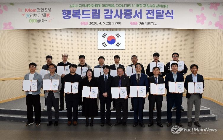 팩트메인뉴스 이훈 기자 | 김제시는 6일 시청 대회의실에서 ‘다자녀가정⇔기업․단체 행복드림 매칭사업’에 참여한 후원업체 대표 및 관계자들을 초청해 감사증서를 전달했다고 밝혔다.