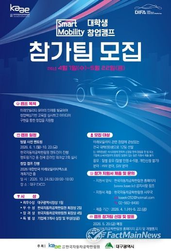 팩트메인뉴스 이훈 기자 | 대구광역시는 자동차 산업 원로들의 풍부한 현장 경험과 청년들의 혁신적인 아이디어를 결합해 미래모빌리티 핵심 인재를 육성하는 ‘2026 스마트 모빌리티 창업캠프’ 참가팀을 모집한다.