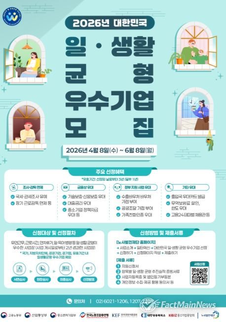 팩트메인뉴스 이훈 기자 | 노동자의 일·생활 균형을 적극적으로 실천하는 기업이 인재 확보에 성과를 거두고 있다. 고용노동부는 이러한 우수사례 확산을 위해 산업통상부, 중소벤처기업부, 한국노동조합총연맹, 한국경영자총협회, 대한상공회의소, 중소기업중앙회와 함께 「대한민국 일・생활 균형 우수기업」을 4월 8일부터 모집한다고 밝혔다.