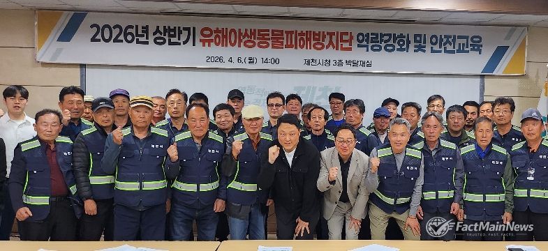 팩트메인뉴스 이훈 기자 | 제천시는 지난 4일 시청 박달재실에서 유해야생동물 피해방지단과 시청, 야생생물관리협회, 국민안전교육센터 관계자 등 40여 명이 참석한 가운데 ‘2026년 유해야생동물 피해방지단 역량 강화 및 안전교육’을 실시했다.