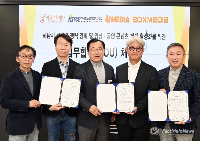 팩트메인뉴스 이훈 기자 | 하남문화재단이 4월 7일 (사)한국방송영상제작사협회(KIPA), ㈜앤미디어, ㈜박스미디어와 각각 업무협약(MOU)을 체결했다. 이번 협약식에는 이현재 하남문화재단 이사장, 이교욱 대표이사를 비롯한 각 기관 관계자들이 참석했다.