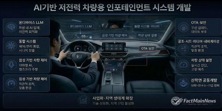 팩트메인뉴스 이훈 기자 | 대구광역시는 산업통상부 주관 ‘2026 지역앵커기업-지역대학 전략기술 공동개발사업’ 공모에 ‘SDV 환경에 최적화된 AI 기반 저전력 통합 차량 인포테인먼트 시스템 개발’ 사업이 최종 선정됐다고 밝혔다.