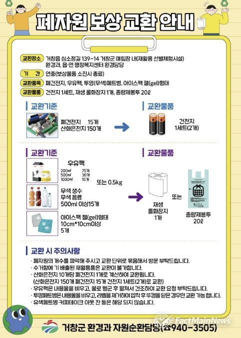 팩트메인뉴스 이훈 기자 | 거창군은 자원순환 실천과 올바른 분리배출 문화 정착을 위해 폐자원보상 교환 사업을 확대 시행한다고 9일 밝혔다.
