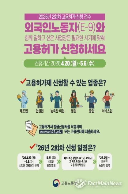 팩트메인뉴스 이훈 기자 | 고용노동부는 4월 20일부터 5월 6일까지 전국 지방고용노동관서를 통해 2026년도 2회차 외국인노동자(E-9) 신규 고용허가 신청을 받는다고 밝혔다.