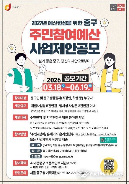 팩트메인뉴스 이훈 기자 | 서울 중구가 2027년 주민참여예산 사업 제안을 오는 6월 19일까지 접수한다. 주민참여예산에 대한 이해도를 높이기 위한 예산학교는 올해 기초 및 심화 과정으로 확대해 운영한다.