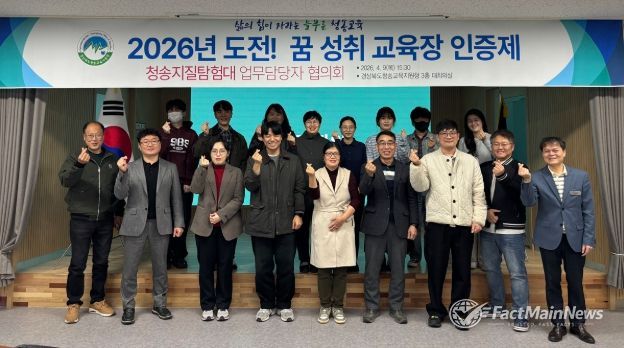 팩트메인뉴스 이훈 기자 | 경상북도청송교육지원청은 2026년 4월 9일 15시 30분 청송교육지원청 대회의실에서 2026년‘도전! 꿈 성취 교육장 인증제’인 청송 지질탐험대 업무 담당자 협의회를 실시했다.
