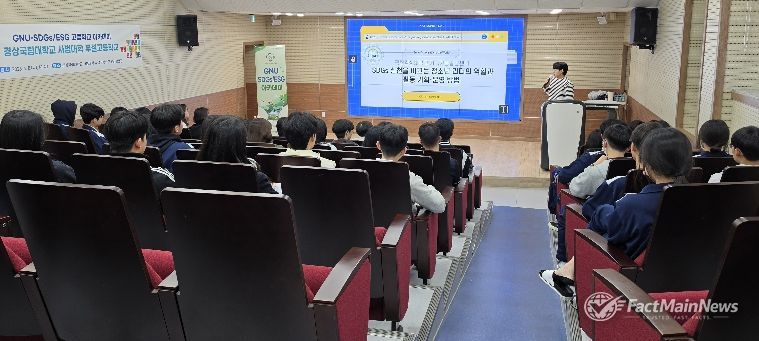 팩트메인뉴스 이훈 기자 | 경상국립대학교 지속가능발전센터는 4월 8일 사범대학 부설고등학교 영상활용관에서 고등학생 47명을 대상으로 ‘SDGs 실천을 이끄는 청소년 리더의 역할과 활동 기획·운영 방법’이라는 주제로 교육을 진행했다.