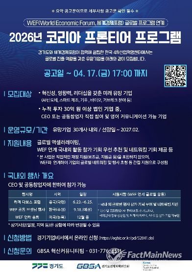 경기도 4차산업혁명센터(C4IR KOREA)는 글로벌 진출 역량을 갖춘 기술 선도 기업을 대상으로 ‘2026년 코리아 프론티어(Korea Frontiers)’ 참가 기업을 오는 17일까지 모집한다고 밝혔다.