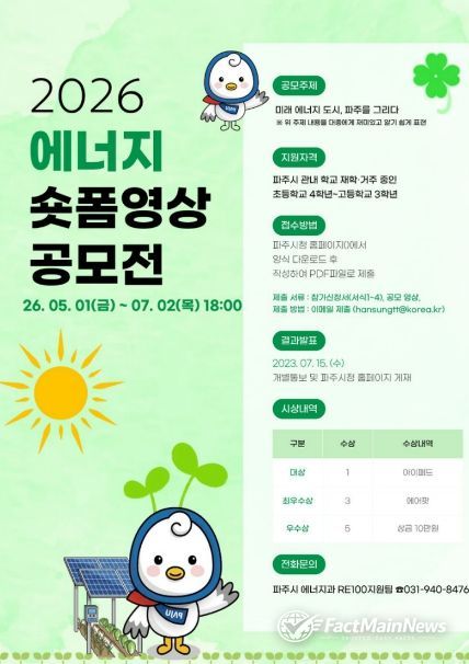팩트메인뉴스 이훈 기자 | 파주시는 청소년들의 에너지 인식을 제고하고 디지털 미디어 활용 역량을 강화하기 위해 녪년 파주시 청소년 에너지 숏폼 영상 공모전’을 개최한다.