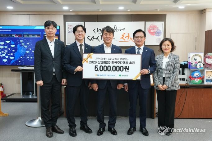팩트메인뉴스 이훈 기자 | 천안시는 13일 농협중앙회 천안시지부가 제104회 어린이날 기념 ‘2026 천안어린이행복주간’의 성공적인 운영을 위해 후원금 500만 원을 기탁했다고 밝혔다.