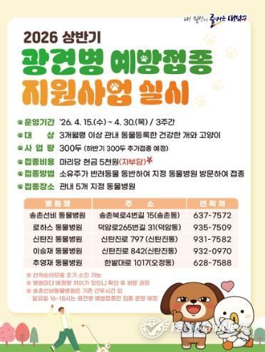 팩트메인뉴스 이훈 기자 | 대전 대덕구가 반려동물 전염병 예방과 구민 복지 증진을 위해 오는 4월 15일부터 30일까지 ‘2026년 상반기 광견병 예방접종 지원사업’을 실시한다.