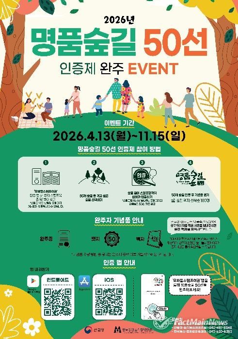 팩트메인뉴스 이훈 기자 | 산림청은 숲길을 활용한 국민의 여가 활성화 및 지역경제 활성화를 위해 ‘2026년 명품숲길 50선 완주 인증제’를 11월 15일까지 운영한다고 13일 밝혔다.