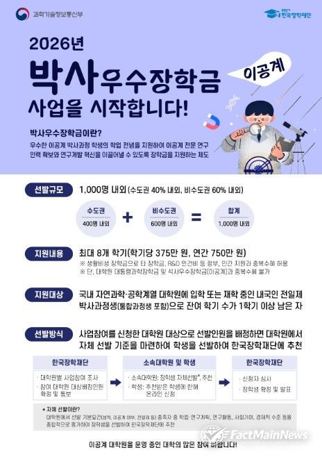 팩트메인뉴스 이훈 기자 | 과학기술정보통신부와 한국장학재단은 2026년도 이공계 박사 우수장학금 사업을 올해 처음으로 시행한다고 밝혔다. 이공계 박사 우수장학금은 사업 참여를 신청한 대학원의 소속 학생 중 장학생을 선발하며, 대학원의 사업 참여 신청 기간은 4월 14일부터 4월 20일까지이다.