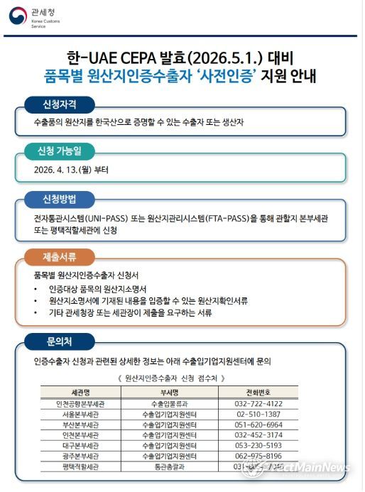 팩트메인뉴스 이훈 기자 | 관세청은 오는 5월 1일 발효되는'한-아랍에미리트연합국(UAE) 포괄적경제동반자협정(CEPA)'를 우리 수출기업들이 발효 첫날부터 즉시 활용할 수 있도록, 4월 13일부터 품목별 원산지인증수출자 ‘사전인증’ 신청·접수를 시작했다.