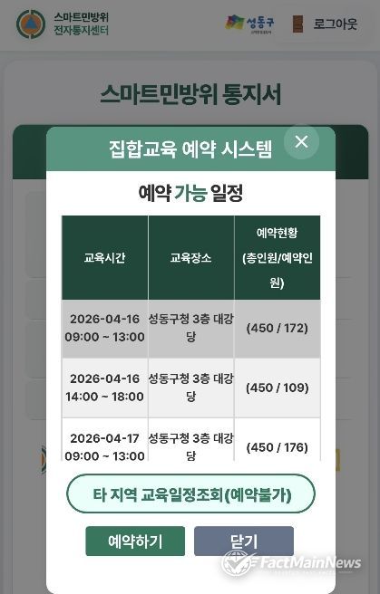 팩트메인뉴스 이훈 기자 | 서울 성동구는 민방위 대비 태세 강화를 위해 성동구 소속 민방위 대원을 대상으로 ‘2026년 상반기 민방위 교육’을 실시한다고 밝혔다.