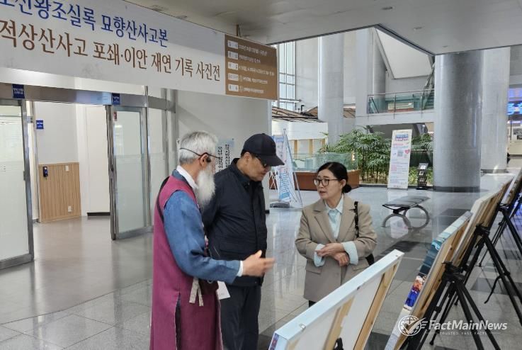 이 자리에서는 ‘조선왕조실록 묘향산사고본 적상사고 포쇄·이안 재연’ 사진 40여 점(1점 89*59cm)을 비롯해 자료 저장소와 연계된 ‘QR 코드’를 통해 재연 영상이나 설명을 볼 수 있다.