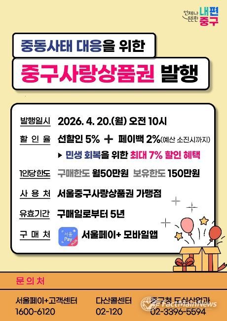 팩트메인뉴스 이훈 기자 | 서울 중구가 중동전쟁으로 인한 경기 불안과 소비 위축에 대응하기 위해 20억 원 규모의 '서울중구사랑상품권'을 오는 20일 발행한다.