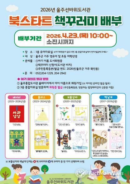 팩트메인뉴스 이훈 기자 | 울주군 군립도서관 3개소(울주선바위도서관, 울주옹기종기도서관, 울주천상도서관)가 오는 23일 ‘세계 책의 날’을 맞아 영유아 및 초등 저학년 어린이를 대상으로 ‘북스타트 책꾸러미’를 배부한다고 16일 밝혔다.