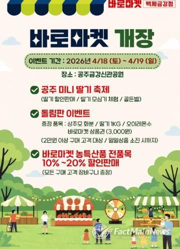 팩트메인뉴스 이훈 기자 | 공주시는 오는 4월 18일부터 금강신관공원 일원에서 ‘2026년 바로마켓 광역 직거래 장터 ‘바로마켓 백제금강점’을 개장하고 본격 운영에 들어간다고 밝혔다.