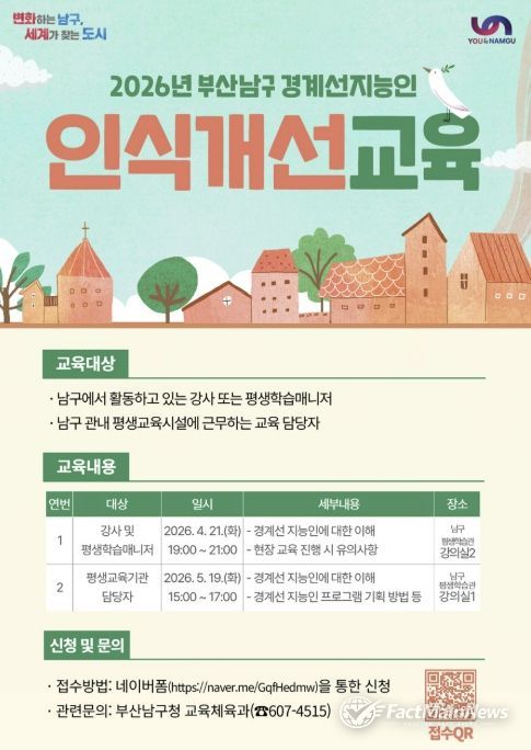 팩트메인뉴스 이훈 기자 | 부산 남구는 경계선지능인의 이해를 높이고 포용적인 지역사회를 조성하기 위해‘경계선지능인 인식 개선 교육’ 참여자를 모집한다.