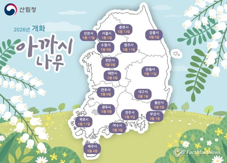 팩트메인뉴스 이훈 기자 | 산림청 국립산림과학원은 봄기운이 완연해지는 시기를 맞아 4~5월에 꽃을 피우는 주요 밀원수종인 아까시나무와 마가목의 ‘봄철 꽃나무 개화 시기 예측 지도’를 발표했다.