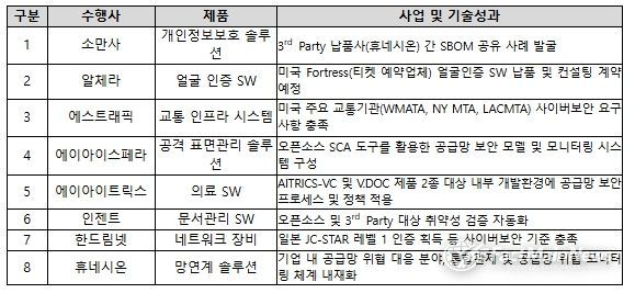 특히, 이번 지원사업은 단순히 재정적 지원에 그치지 않고 미국·유럽연합 등 주요국의 보안 요구사항 충족, 보안 취약점 조치 등을 위한 기술지원까지 함께 제공하여 소프트웨어 공급망 보안에 대한 기업들의 부담과 어려움을 최소화했으며, 실제로 해당 사업을 통해 취약점을 발굴하고 조치한 후 해외 기업과 납품 계약을 채결한 사례 또한 존재할 만큼 처음 수행한 사업임에도 많은 성과를 거둘 수 있었다.