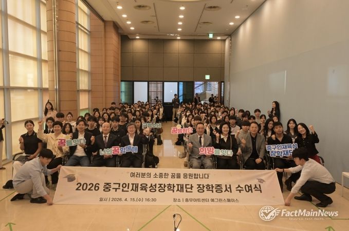 팩트메인뉴스 이훈 기자 | 서울 중구는 중구인재육성장학재단이 장학생 178명에게 총 1억 5,970만 원의 장학금을 전달했다고 밝혔다. 재단은 지난 15일 오후 충무아트센터 예그린스페이스에서 ‘2026년 장학증서 수여식’을 개최했다.