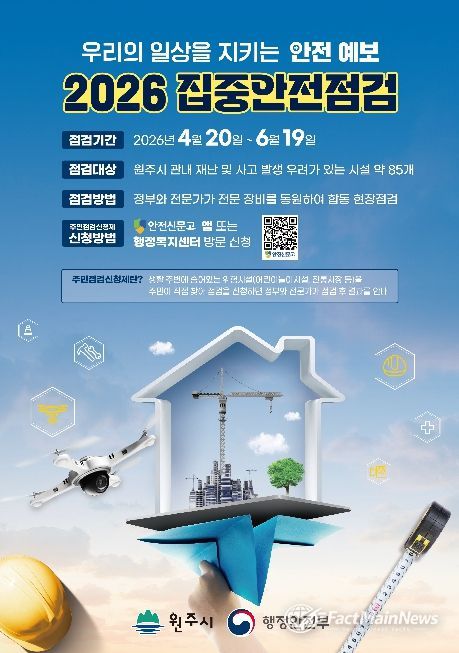 팩트메인뉴스 이훈 기자 | 원주시는 4월 20일부터 6월 19일까지 61일간 ‘2026년 집중안전점검’을 추진한다.