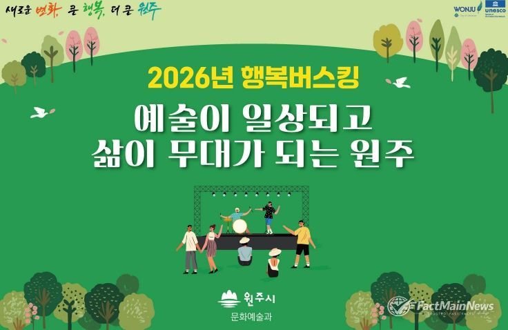 팩트메인뉴스 이훈 기자 | 원주시는 지역 예술가들의 공연 기회를 확대하고 시민들에게 다양한 문화서비스를 제공하기 위해 ‘2026년 상반기 원주행복버스킹’을 운영한다.