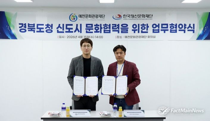 팩트메인뉴스 이훈 기자 | (재)한국정신문화재단과 (재)예천문화관광재단이 안동과 예천을 잇는 광역 연계 생활권 기반 문화협력의 물꼬를 텄다. 양 기관은 지난 15일 예천군문화회관에서 ‘경북도청 신도시 문화협력을 위한 업무협약(MOU)’을 체결하고, 공동 문화사업 추진을 위한 상호 협력 체계를 구축했다고 밝혔다.